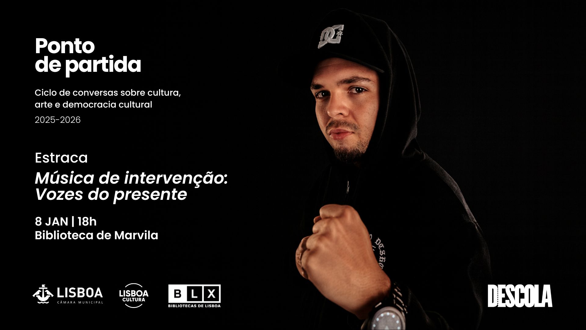 Dedicada à Música de Intervenção: Vozes do Presente, O DESCOLA dá início a 2026 com mais uma sessão do ciclo de conversas Ponto de Partida. No dia 8 de janeiro, às 18h00, na Biblioteca de Marvila, recebemos Estraca, rapper dos subúrbios de Lisboa e uma das vozes mais marcantes do hip-hop nacional. A partir da sua experiência, vamos refletir sobre a música como forma de resistência, denúncia e transformação social, da tradição da intervenção aos contextos urbanos contemporâneos. A entrada é livre, junte-se a nós!
